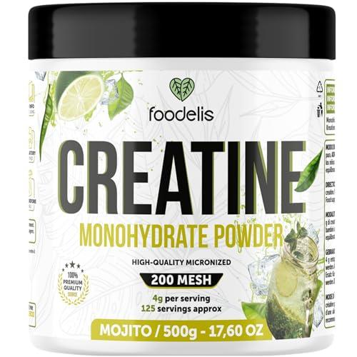 Foodelis Creatina Monohidratada en Polvo 500 g – Sabor Mojito – 100% Creatina Micronizada – Alta Pureza – Sin Aditivos – Vegana – Alta Solubilidad – Incluye Dosificador